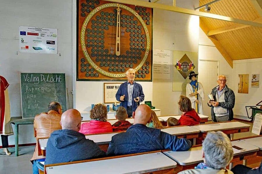 In open air museum de Locht there is a beautiful auction clock in the Asparagus Pavilion, a gift from the ZON auction. This clock was built in 1908. The clock replaced a so-called acoustic auction, where the price of the item was mentioned from high to low. With the one who first called “my”, the sale was closed. The clock (the hand runs along the prices from high to low) was seen as a fairer method. Instead of shouting “my”, one can press a button. Whoever prints first pays the price the clock.